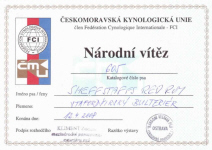 14.03.05 - NV OSTRAVA - VN 1 02.07.05 - NV BRNO - EXCELLENT 08.09.05 - SV - EXCELLENT 4 24.09.05 - NV BRNO - EXCELLENT 1, CAJC 14.01.06 - NV OLOMOUC - EXCELLENT 1, CAC, NATIONAL WINNER 08.04.06 - NV OSTRAVA - EXCELLENT 1, RES.CAC 22.04.06 - MV Č. BUDĚJOVICE - EXCELLENT 1, CAC, CACIB 13.05.06 - KV PRAHA - EXCELLENT 1, CAC, CLUB WINNER 29.05.06 - MV PRAHA - EXCELLENT 1, CAC 24.06.06 - MV BRNO - EXCELLENT 1, CAC, CACIB, BOB 16.09.06 - SV - EXCELLENT 2, RES.CAC 18.11.06 - EXCELLENT 1, CAC, CACIB, BOB 12.01.07 - NV OLOMOUC - EXCELLENT 1, CAC, BOB, NATIONAL WINNER